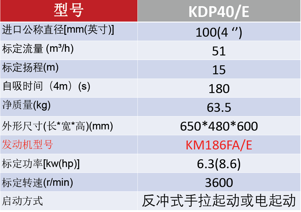 型号:KDP40/E 功率:6.3KW 发动机型号:KM186FA/E