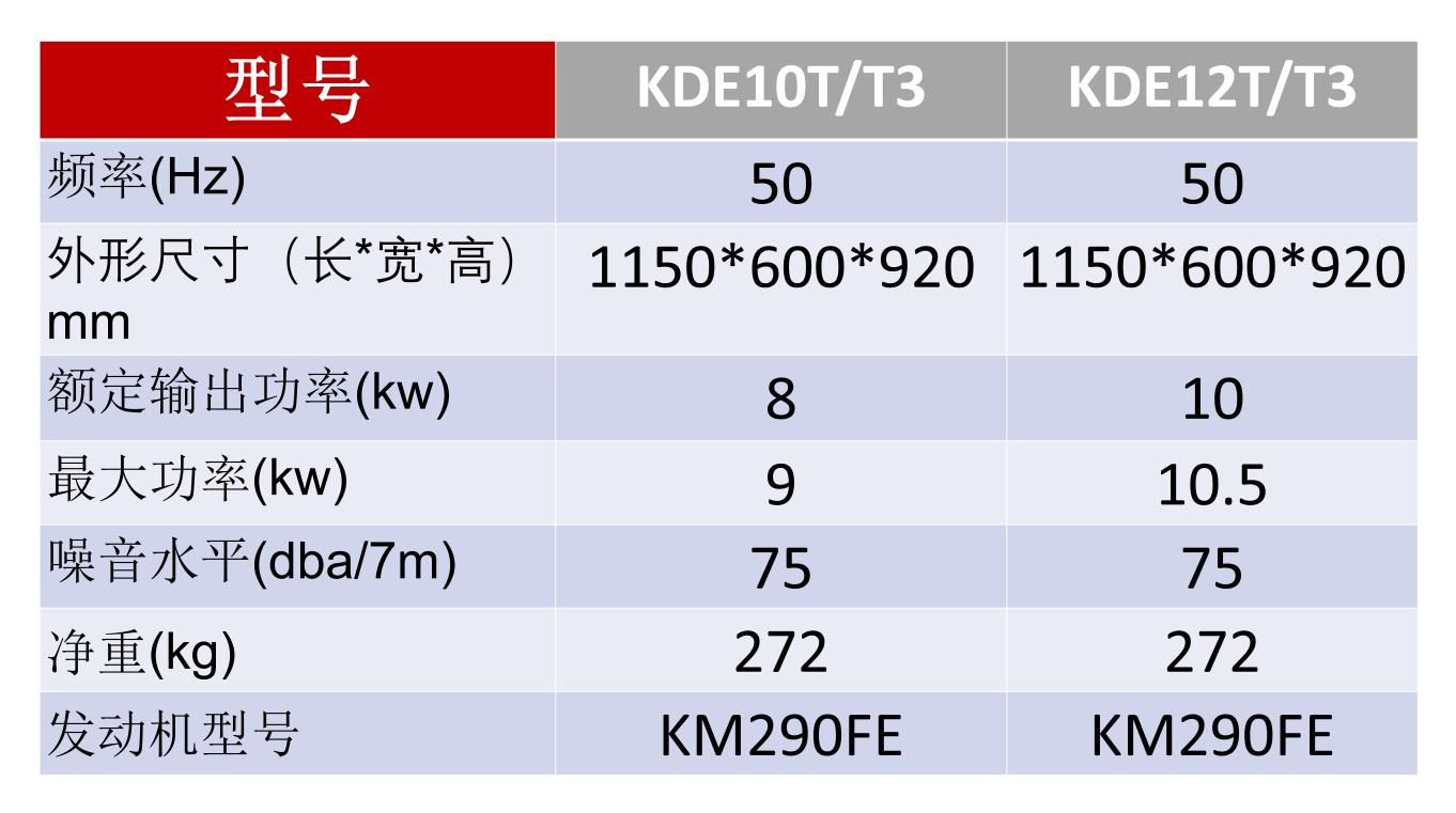 型号:KDE12T/T3 功率:10KW 发动机型号:KM290FE